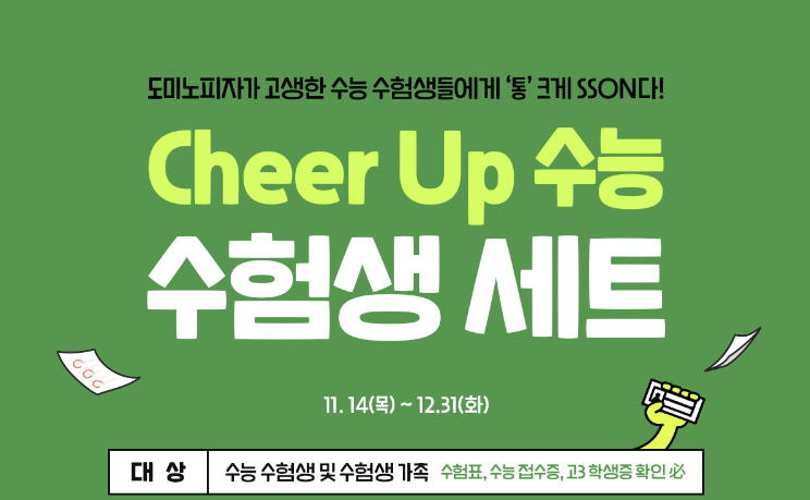 도미노피자에서는 수험생 및 수험생 가족분들에게 할인혜택을 적용한다고 합니다.